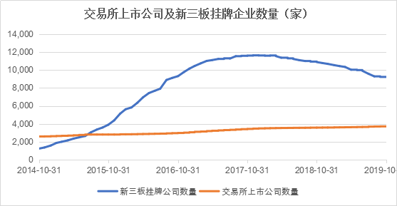 根据Choice金融终端2014年10月8日至2019年11月22日的数据,2014年10月8日,挂牌公司总数为1,160家;2019年11月22日,挂牌公司总数增至9,120家;2017年11月23日,挂牌公司数量达到峰值11,651家。从总量数据来看,新三板自设立以来,挂牌公司数量和市场规模快速增长。