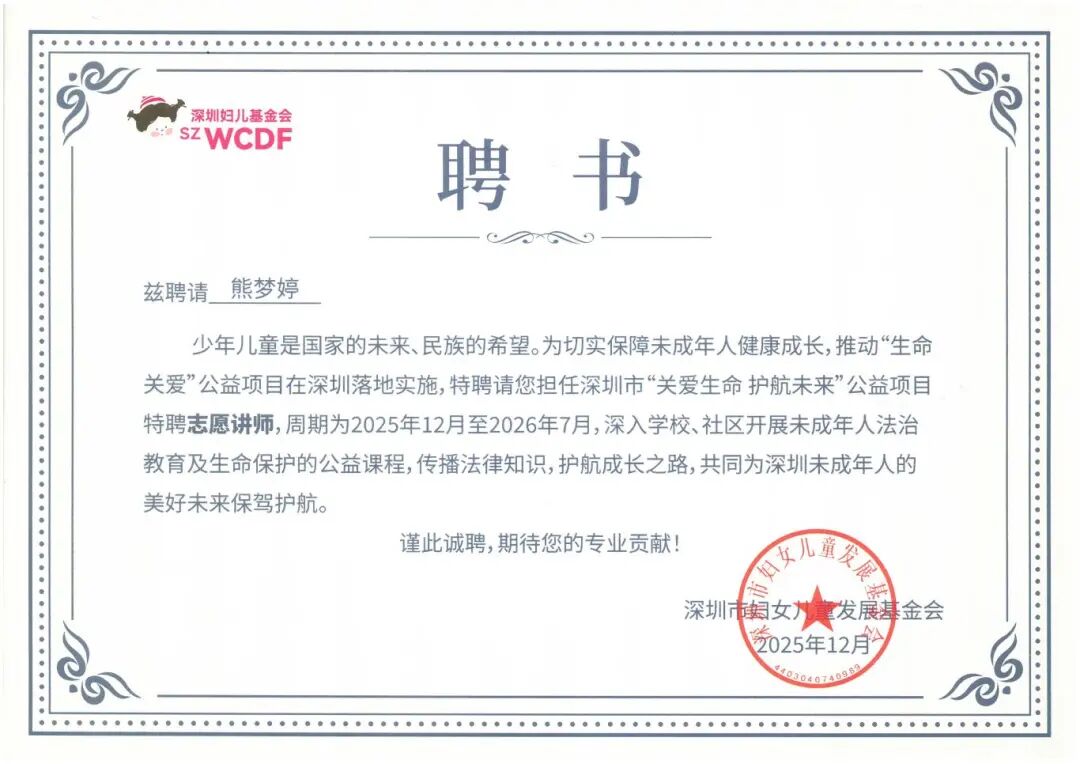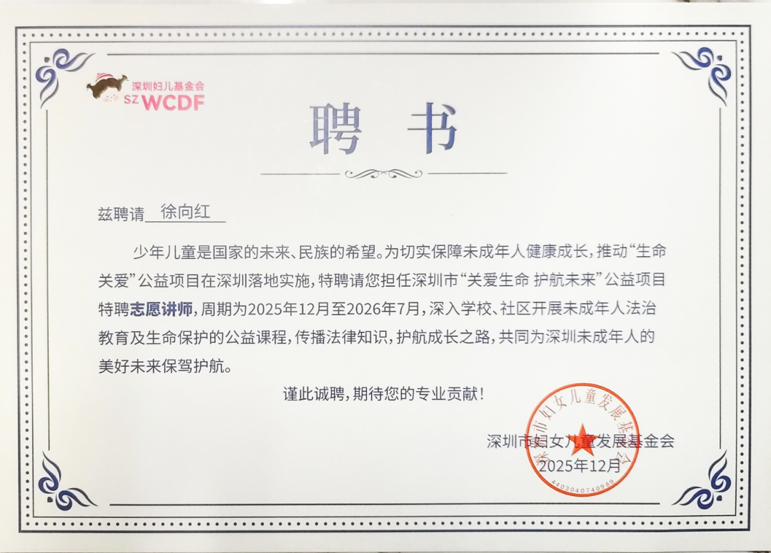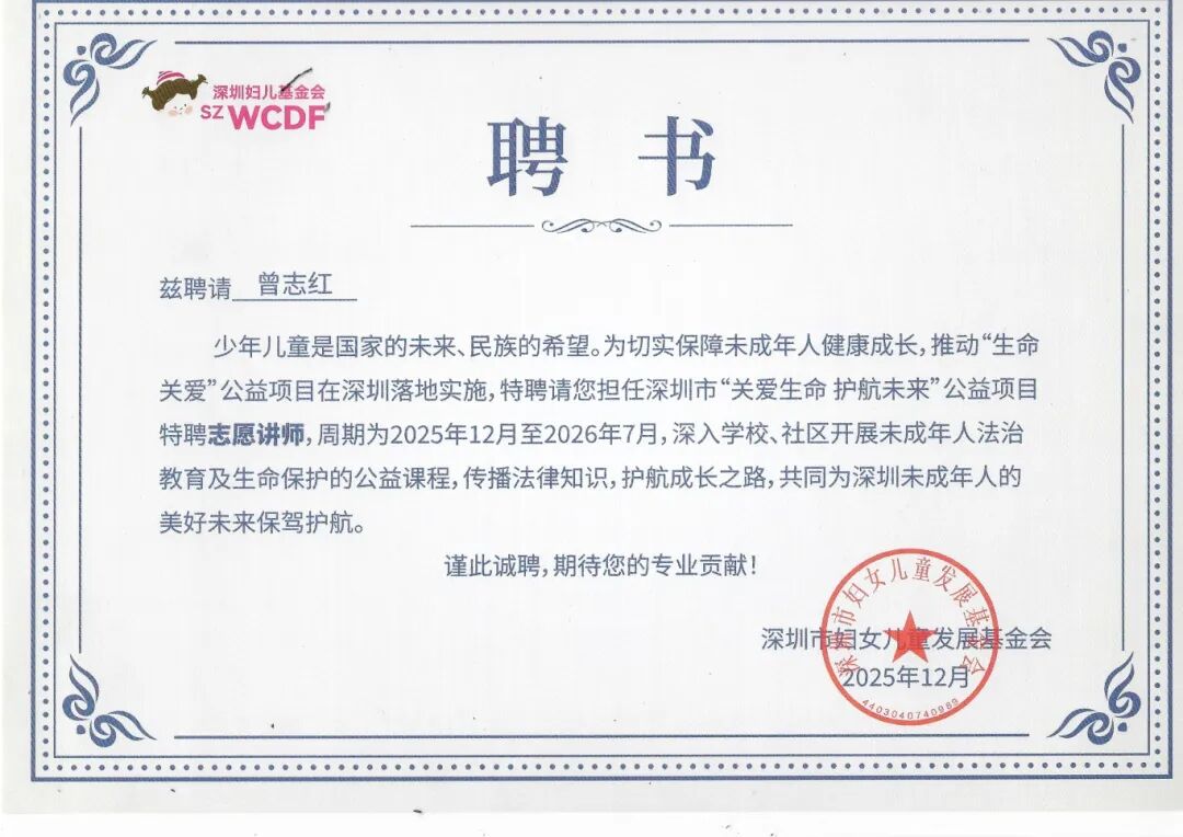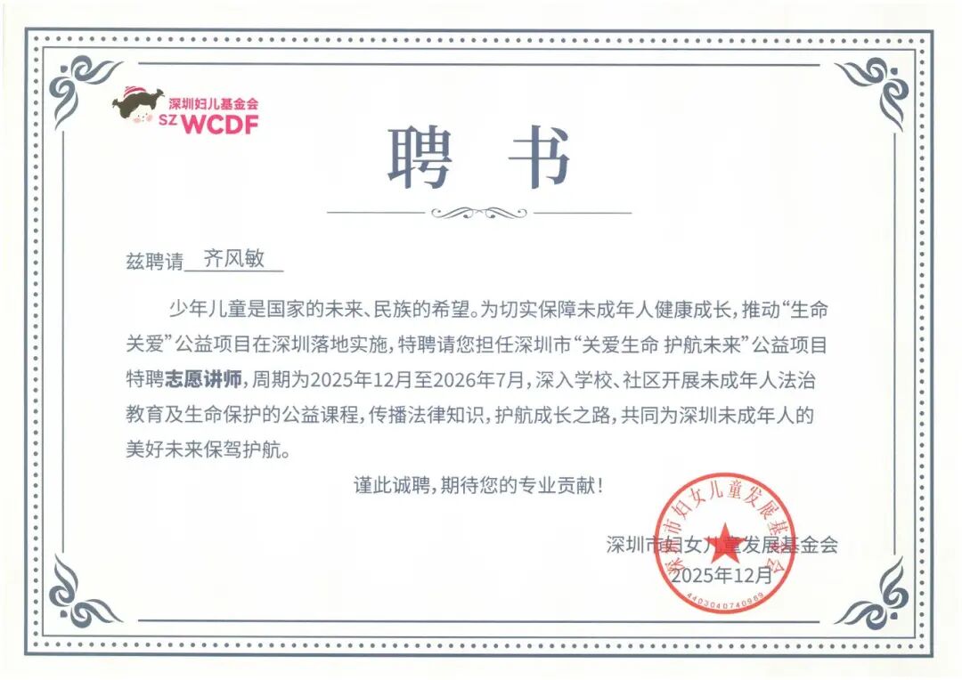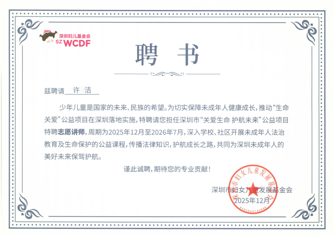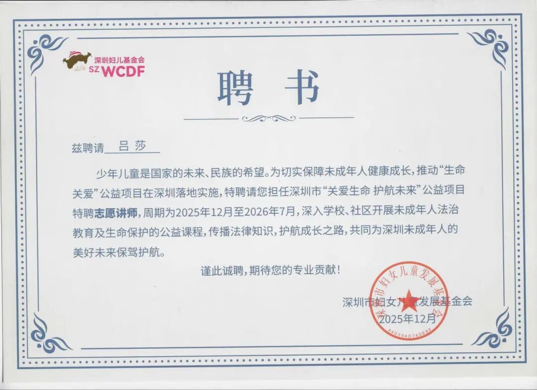 活动中,晟典7位律师被聘请为深圳市“关爱生命 护航未来”公益项目特聘志愿讲师,并被授予证书,周期为2025年12月至2026年7月,将深入学校、社区开展未成年人法治教育及生命保护的公益课程,传播法律知识,护航成长之路,共同为深圳未成年人的美好未来保驾护航。
