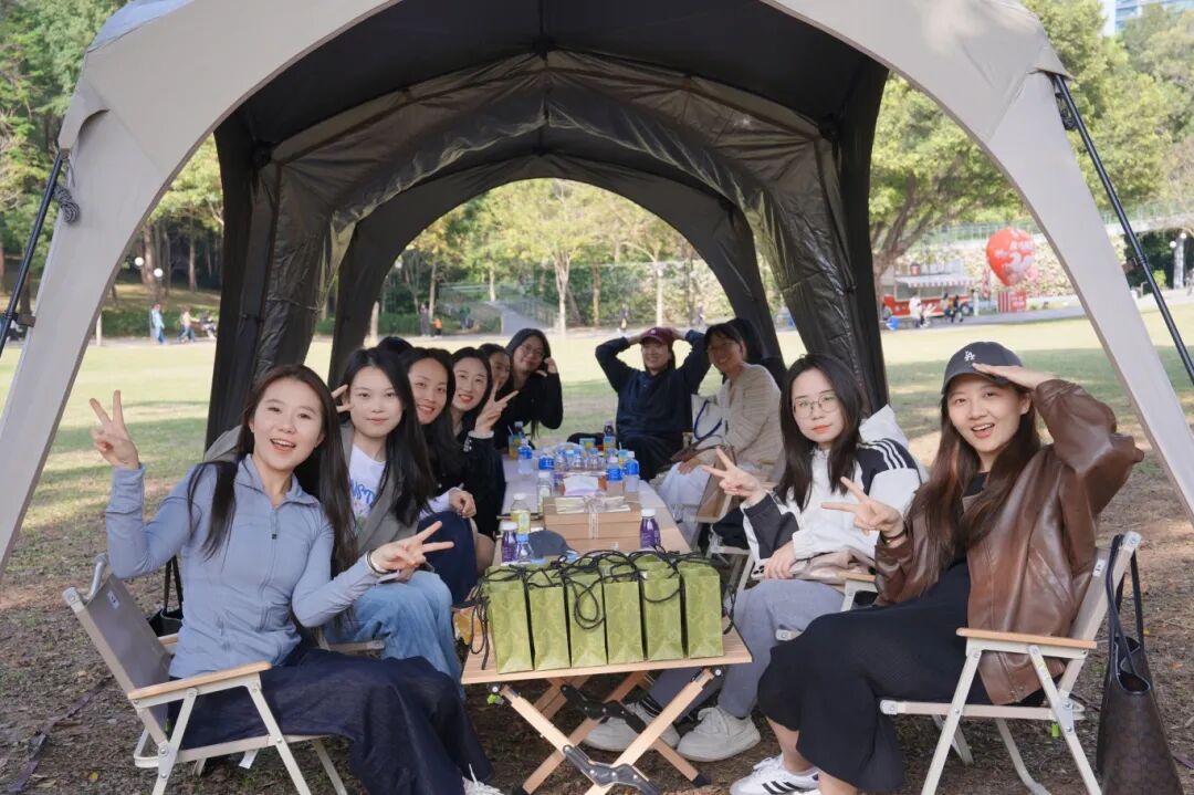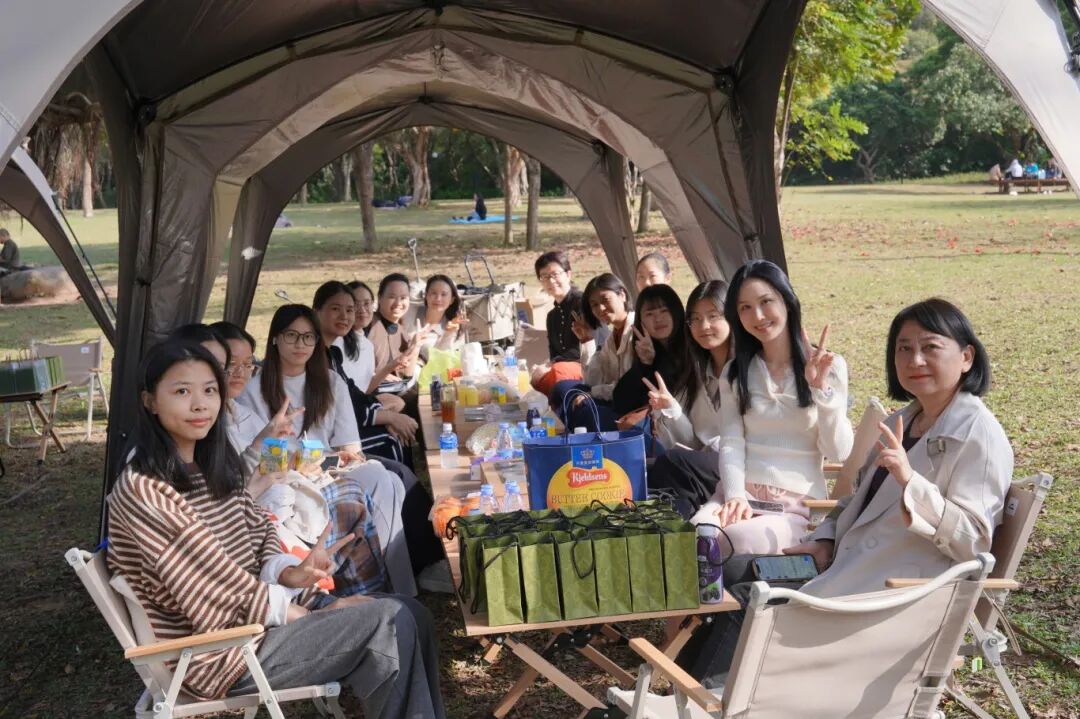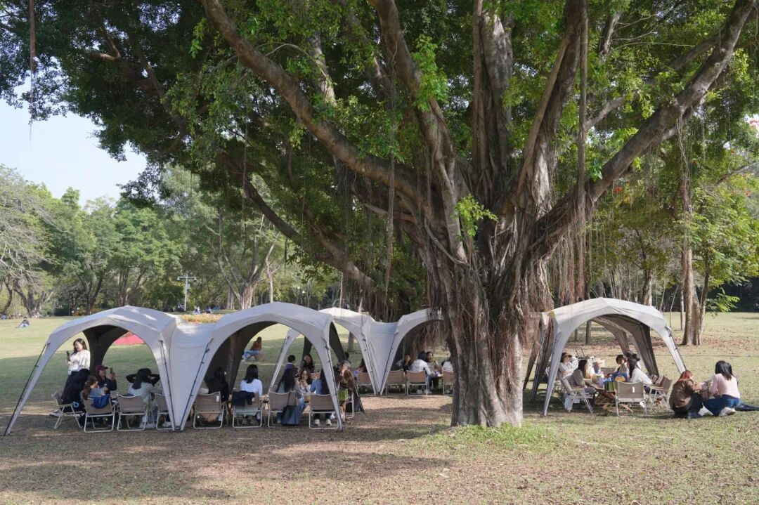 从山顶漫步而下,众人来到莲花山公园蔬林草地。卸下工作时的严肃,大家或坐或卧,或品茗闲谈,或闭目养神,或三五成群拍照留念。微风穿过树林,带来青草的香气,工作中的严谨与紧绷,在此刻化作轻松与惬意。