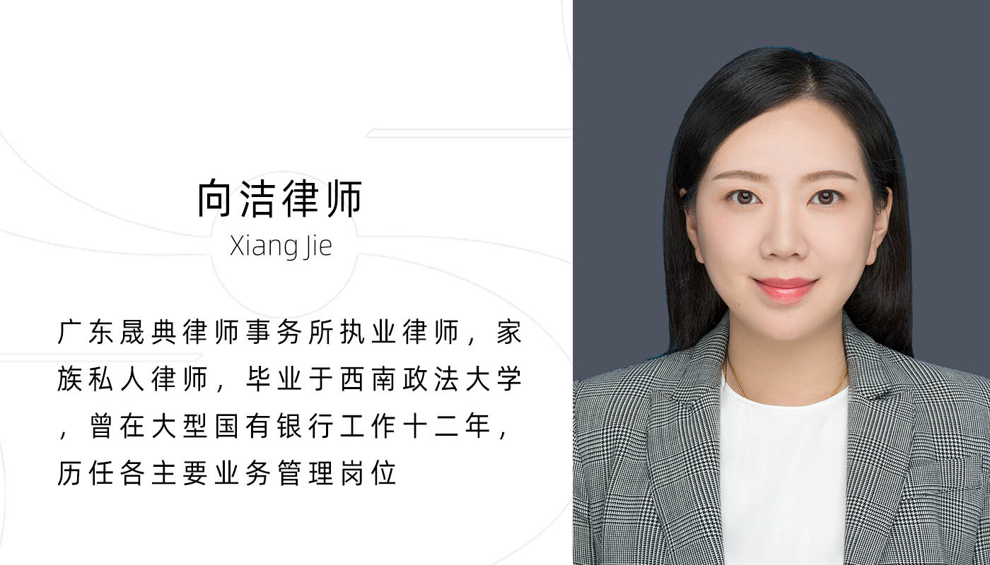 向洁律师:家族私人律师,毕业于西南政法大学,曾在大型国有银行工作 12 年,历任各主要业务管理岗位,具备跨行业金融专业知识和服务私人银行客户丰富经验,擅长运用各类金融工具,结合法律专业知识为家族或个人制定前期风控方案、专业解决方案,全方位解决各类纠纷;量身定制家族财富管理与传承方案,为多个高净值家庭提供专业综合服务,包括企业股权设计、家族信托设计、意定监护、遗嘱、保险、家企隔离、婚前财产处理和协议制定及家族涉及的各类民商事纠纷。